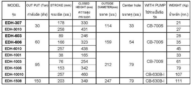 EDH-series ประกอบด้วยการออกแบบลูกสูบกลวงที่ช่วยให้เกิดแรงผลักและแรงดึงได้ โครงสร้างเหล็กอัลลอยด์ที่มีความแข็งแรงสูงช่วยเพิ่มความทนทานสูงสุด การทำงานแบบสองจังหวะ ช่วยให้ลูกสูบตอบสนองได้รวดเร็ว มีวาวล์นิรภัยในตัวป้องกันแรงดันเกิน ลูกสูบกลวงช่วยให้สามารถสอดแกนหรือสายเคเบิลได้ตลอดความยาวตัวกระบอกสูบ ในขณะที่การออกแบบแบบทำงานสองทางช่วยเพิ่มความเร็วในการทำงานเมื่อจำเป็นต้องใช้กระบอกสูบที่มีระยะชักที่ยาวขึ้น สามารถใช้ในการสร้างความตึง การทดสอบโหลด การดึงบูช และการบำรุงรักษา กระบอกสูบทั้งหมดในกลุ่มนี้มีรูยึดฐาน สามารถปรับแต่งน้ำหนักและระยะชักอื่นๆ ได้ตามการใช้งาน