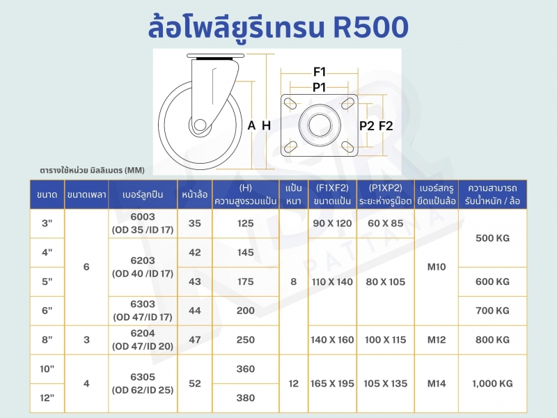 ล้อโพลียูรีเทรน (PU) ขาเชื่อมหนาพิเศษ R500 แบบล้อเป็น–เบรก (Swivel Caster with Brake) ผลิตจาก PU เกรดอุตสาหกรรม สีเหลือง แข็งแรงและยืดหยุ่น ขาเชื่อมเหล็กหนาพิเศษ พร้อมลูกปืนคุณภาพสูง หมุนได้รอบทิศทาง 360° และมาพร้อมระบบเบรกล็อก ช่วยหยุดล้อให้นิ่ง เพิ่มความปลอดภัย